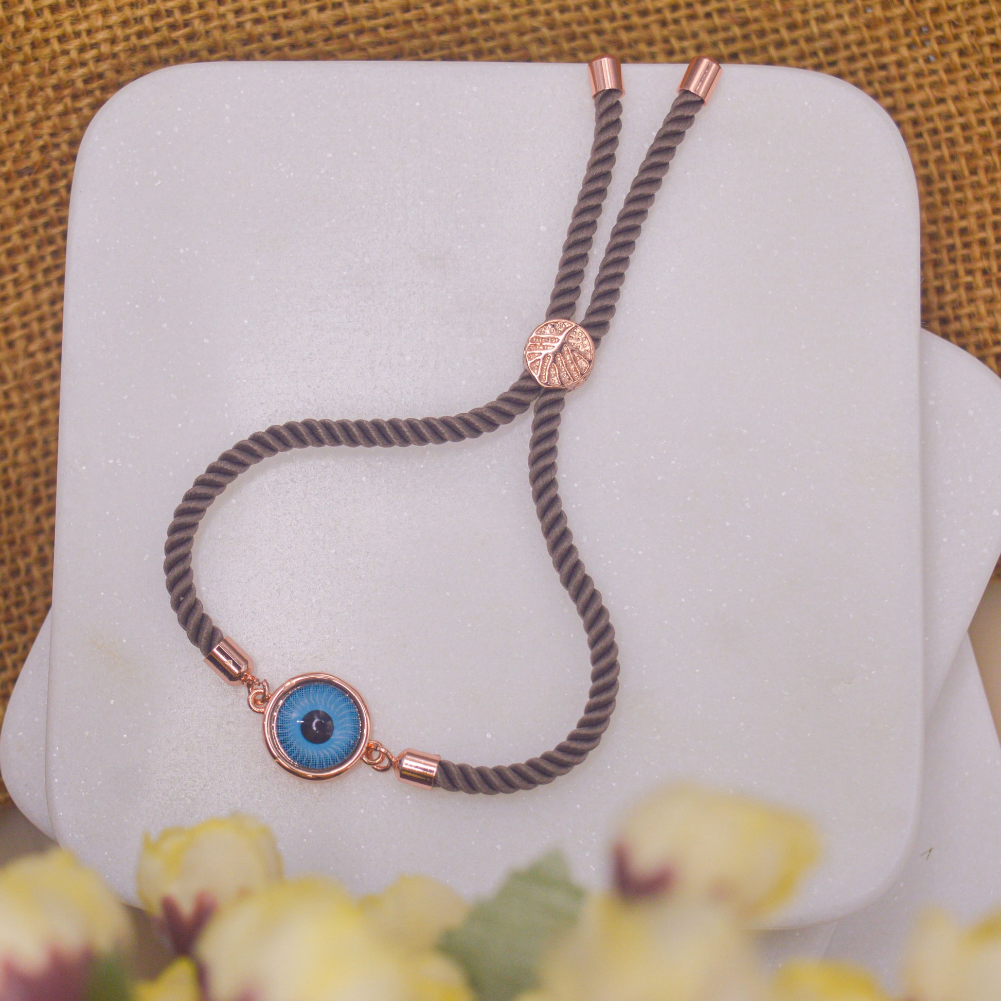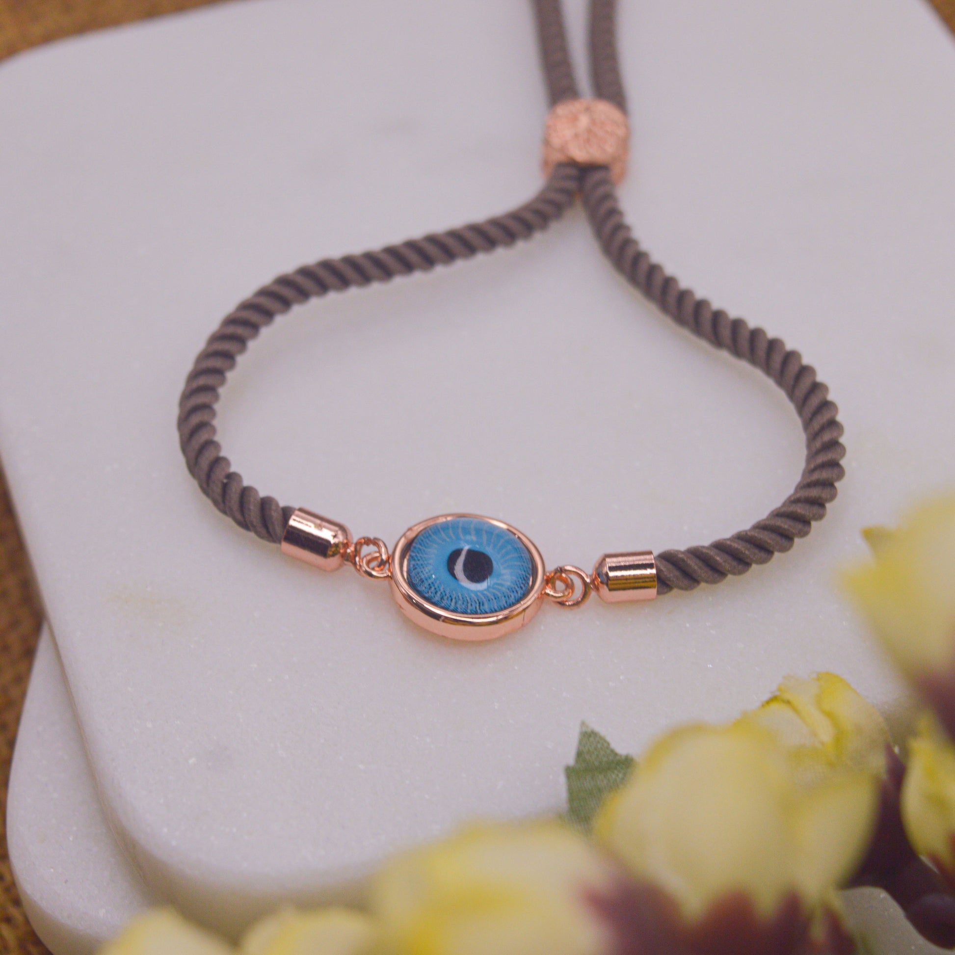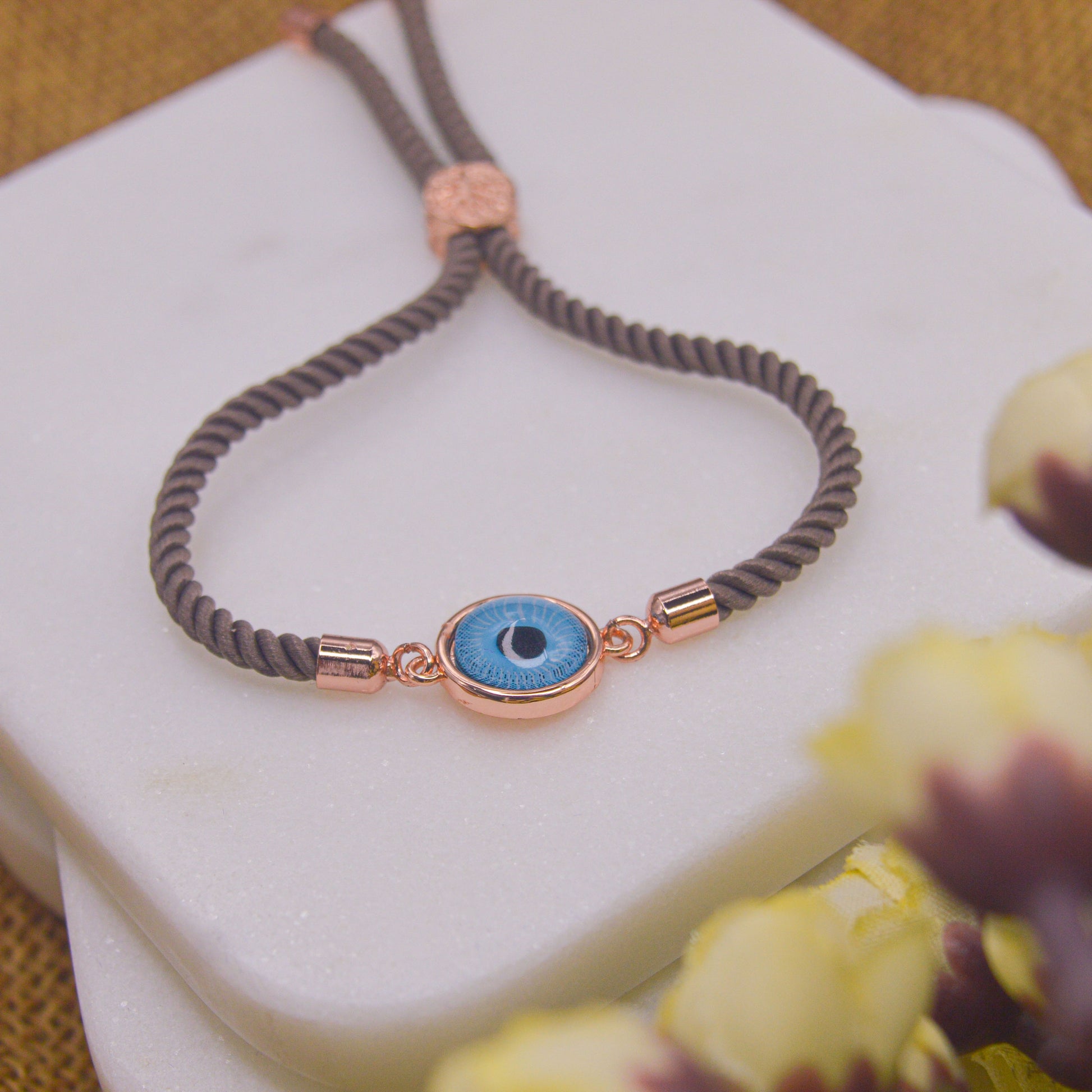 Water Blue Evil Eye Bracelet in Brown Band - Silver