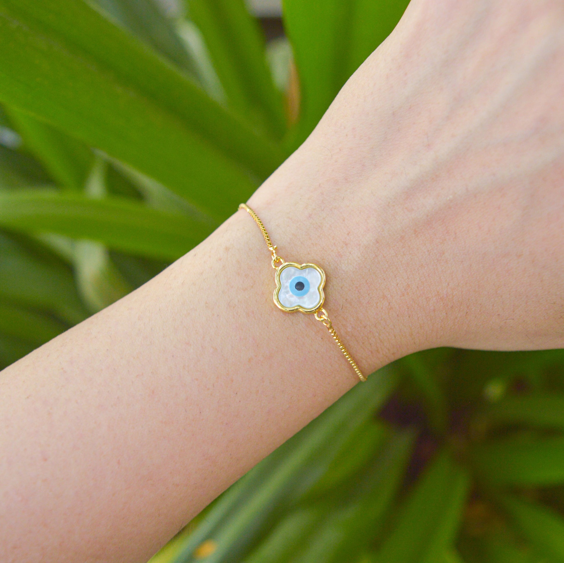 White Clover Mother of Pearl Evil Eye Gold Color Bracelet