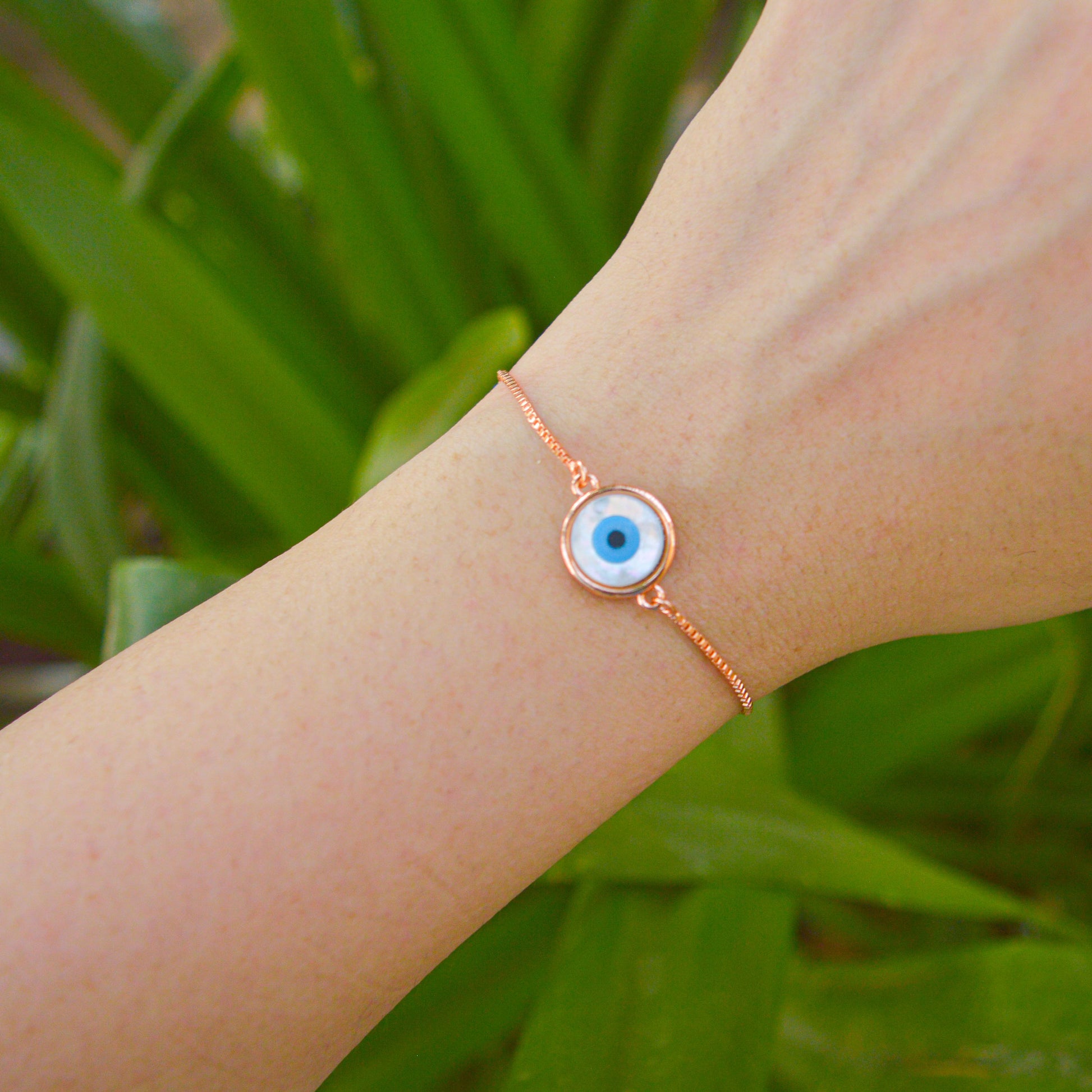 White Round Mother of Pearl Evil Eye Rose Gold Color Bracelet